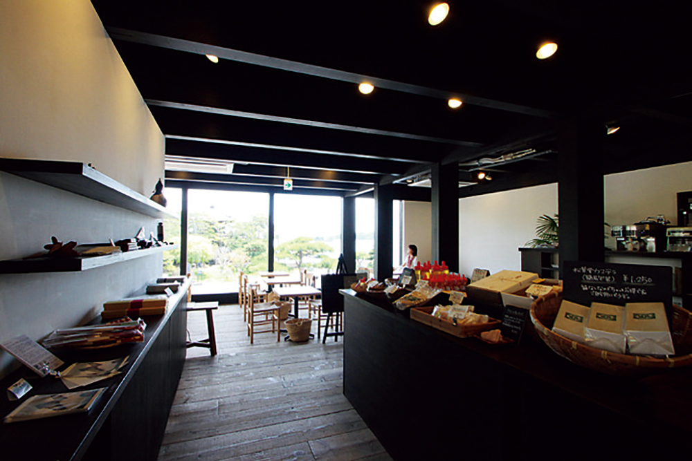 五大堂の目の前、レトロモダンな建物が目印の『松華堂』は、タイリッシュな建物の2階にある喫茶室。工房で丁寧に作られたカステラが評判で、しっとりした食感とやさしい甘さが特徴です。大きな窓から松島湾に浮かぶ五大堂を眺めて過ごせます。1階のお土産処『松島松竹屋』では、和の雑貨や手焼きせんべいを販売しています。