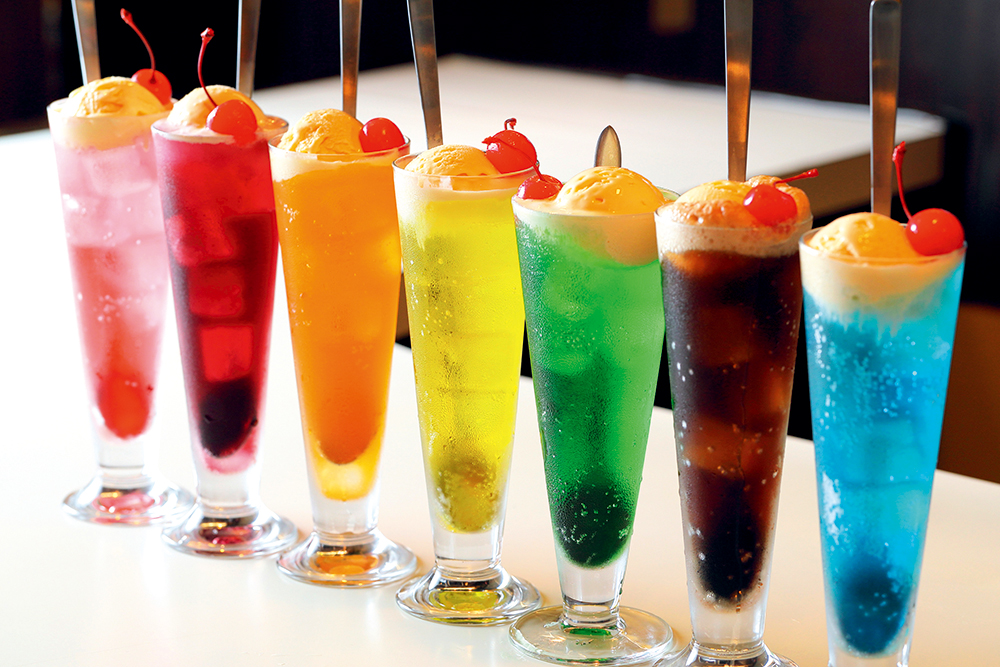 「レインボーフロート」(各400円)。レモンやイチゴ、ブルーハワイなど7種類を提供