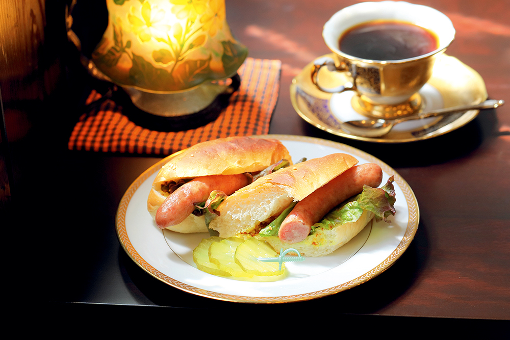世界中から集められたカップや飴色に輝く家具、四季の草花などが彩りを添える店内。高いホスピタリティが他の店と一線を画す『ホシヤマ珈琲店 本店』では、「コーヒーを味わうための時間」が細やかに、そして最大限に演出されています。バンズからはみでるほどボリューミィなソーセージをレタスとともにサンドした「ホットドックセット」。自家焙煎のコーヒー豆で淹れる極上の一杯と合わせて、ここでしか味わうことのできない癒しのひとときを過ごせますよ。