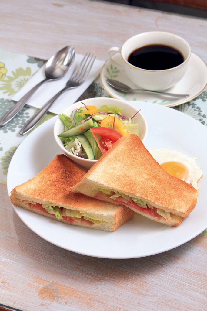 10時まで提供のモーニング。BLTサンド、目玉焼き、サラダ、コーヒー付きで500円