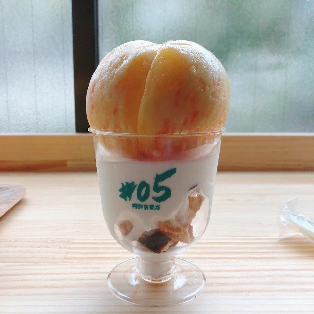 見よ、モモを丸ごと使ったソフトクリームを!こちらは「白桃ソフト」(734円)
