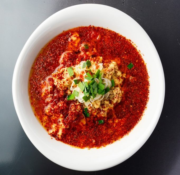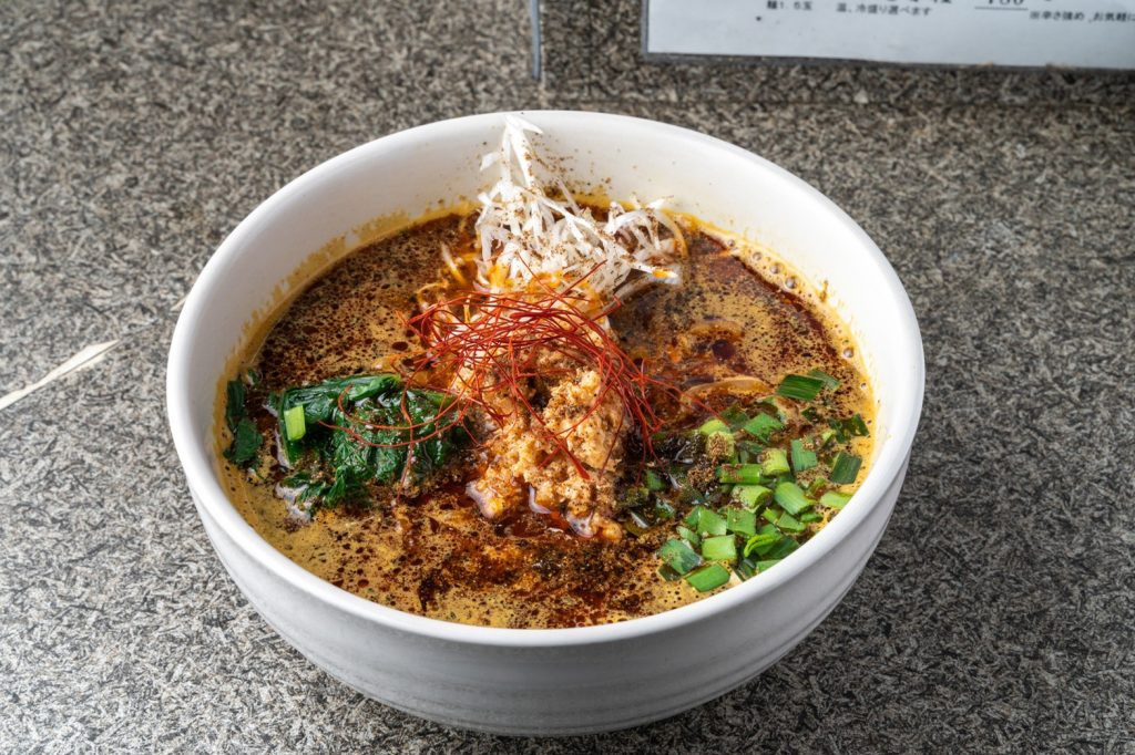 甘みのある寒冷地の唐辛子、スッと抜ける辛さの南方の唐辛子、ビリッとくる花椒やじわじわ染みわたる山椒など、スパイスを自らブレンド。複雑な辛みを作り上げ、ラー油に頼らない担々麺を提供する。煮干し、昆布、鶏、豚で丁寧にとったスープは、歯切れのよい低下水ストレート麺にしっかり辛み、食べごたえも十分。