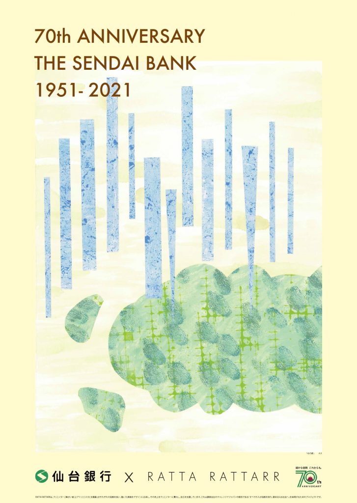 記念ポスターは、「海、山、町、杜の都」などの4種類。仙台銀行がイメージを伝え、『チャレンジドジャパン』のデザイン部門「RATTA RATTARR(ラッタラッタル)」に所属する障がいのあるクリエイターたちがデザインを担当しています。