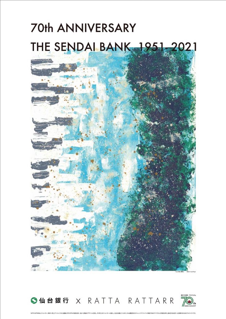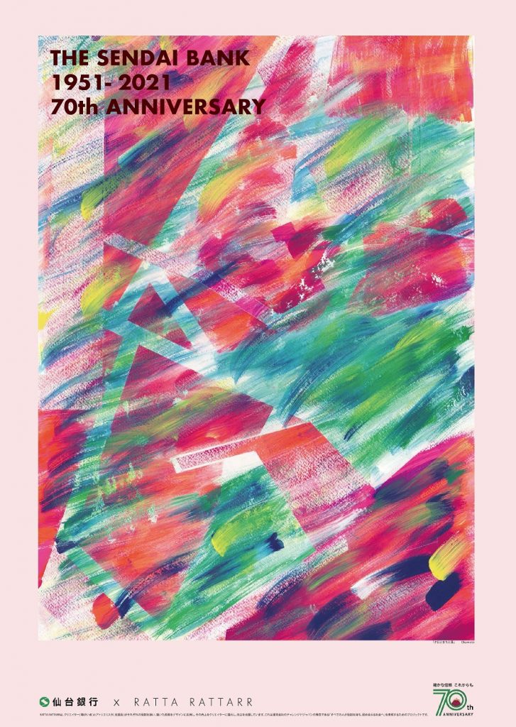 7月5日に創業70周年を迎えた『仙台銀行』。障害者の就労支援をする『チャレンジドジャパン』とコラボレーションして記念ポスターを製作しました。7月5日以降、『仙台銀行』各店舗で掲示するほか、デザイン原画を仙台市青葉区の本店に展示しています。