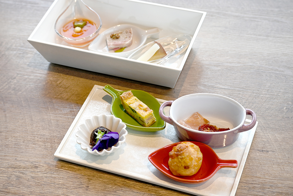 キッシュや生ハムなどを箱皿に詰めた「七ツ森前菜」(550円※ツアー代金とは別途)。七ツ森にちなみ7つの品を盛り合わせて