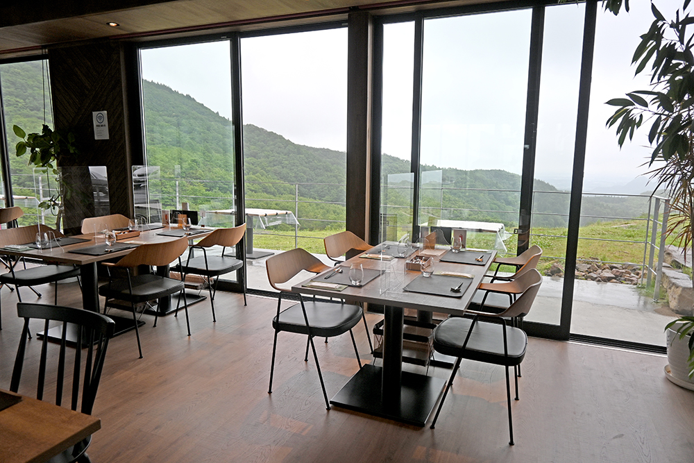 七ツ森の美しい山並みを眺められる店内