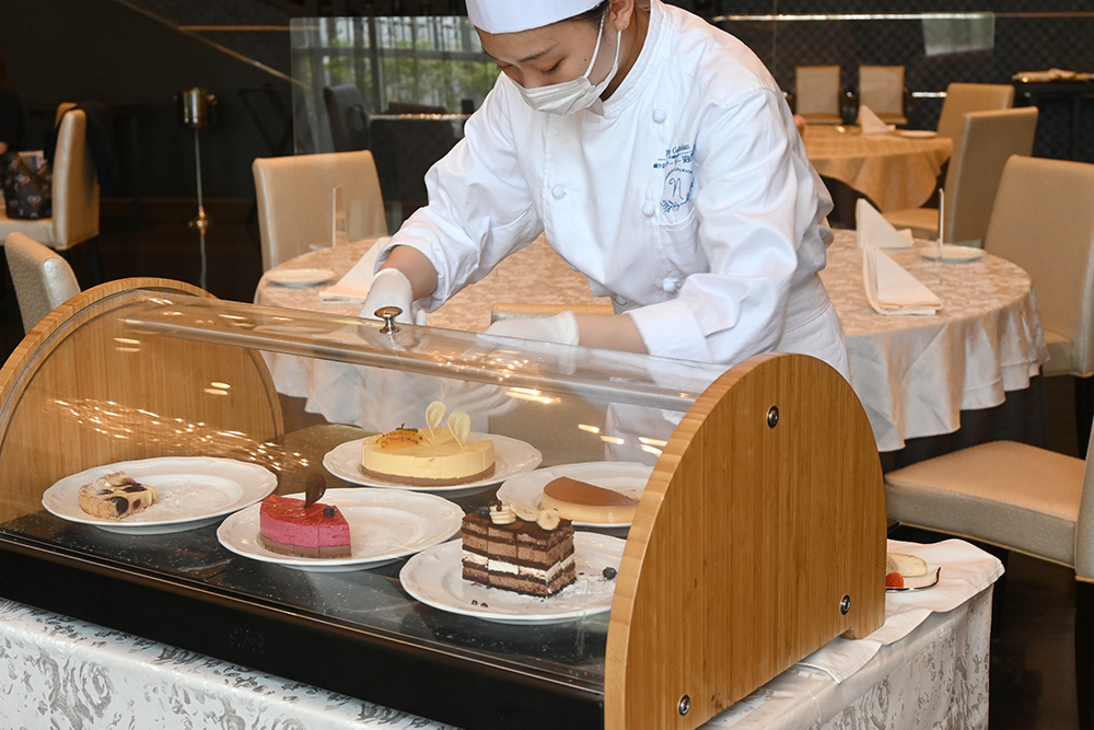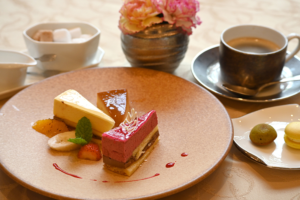 食後のドルチェはワゴンサービスで。5種のケーキから3つが選べる