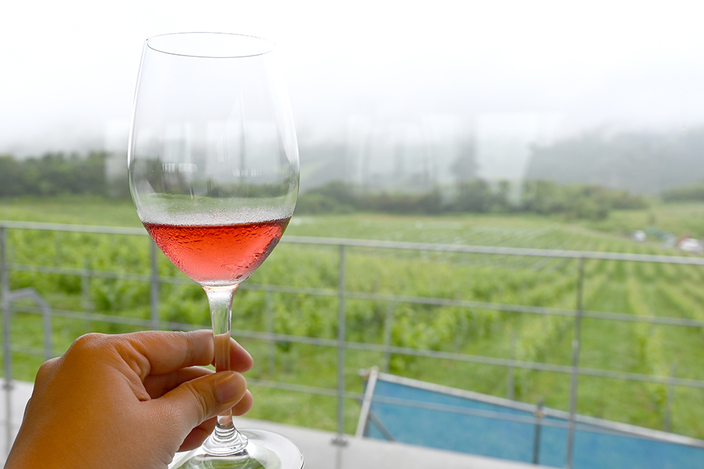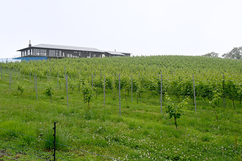 仙台市内から徐々に自然が豊かになっていく景色を楽しみつつ、1つめの目的地である黒川郡大和町にあるワイナリー『了美ヴィンヤード&ワイナリー』へ。到着してまず目に飛び込んできたのは4ヘクタールもの広大なブドウ畑!昨年4月に完成した直営レストラン『了美ワイン&ダイン』や宿泊施設、ドッグランなどを併設した、注目のワイナリーです。