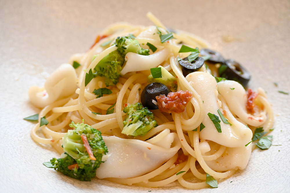 【パスタ】アオリイカドライトマトペペロンチーノ スパゲッティーニ