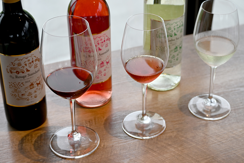 この日のワインは左から「ルージュ スタンダール2019」(赤)、「ロゼ アサンブレ2019」、「甲州シュール リー2019」(白)