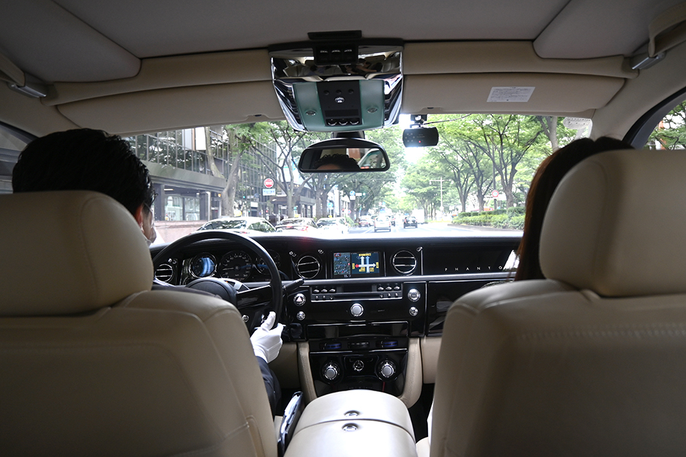 本革シート、フカフカの絨毯、手元のスイッチで好みにセッティングできる電動リクライニングなど、どこを切り取ってもハイグレード!静かな走りが心地良く、乗車中ということ忘れてしまいそうなほど。見慣れたいつもの街並みも、ロールスロイスの車内から見ると特別な景色のように感じられますね。