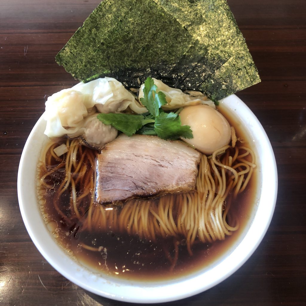 「醤油らーめん」(800円)。こちらは+300円で、肉とエビの2種類のワンタン、味玉、のりがトッピングできる「特製仕様」です