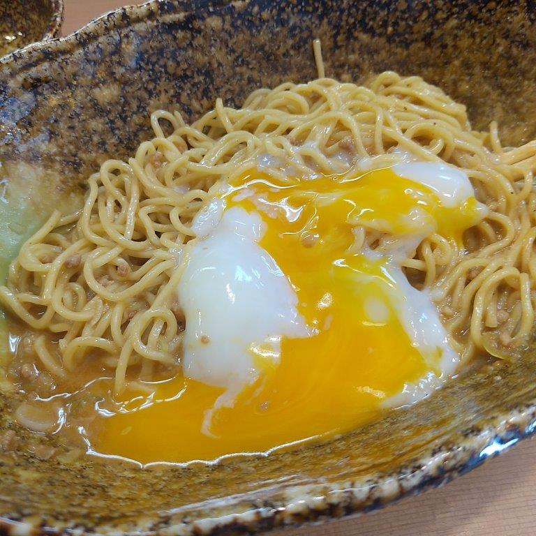 「温泉玉子」(80円)をのせれば、辛みがマイルドになって辛い物が苦手な人にも食べやすくなりますよ