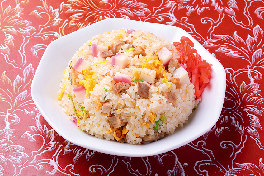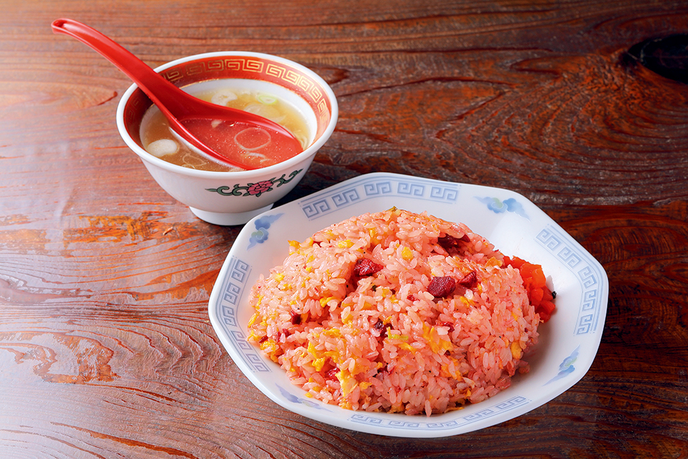 『珍来』のポリシーは「料理を素早く提供する」こと。人気の炒飯も注文からわずか2分で運ばれるそのスピードにも驚きますが、鮮やかな見た目に二度びっくり。色の秘密は、特製スープと醤油で味付けした後、食紅を溶いた水にさらした特製チャーシューにあり!ご飯と一緒に炒めればキレイな紅色炒飯の完成です。醤油が香る絶品炒飯をご賞味あれ。