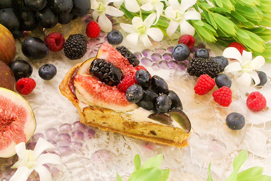 プチプチとした食感のイチジクパウンドとジューシーな5種類のフルーツ、贅沢な組み合わせで作ったタルト。ブドウやベリーの爽やかな味わいと、やさしい甘みのイチジクが一体となって口の中に広がる