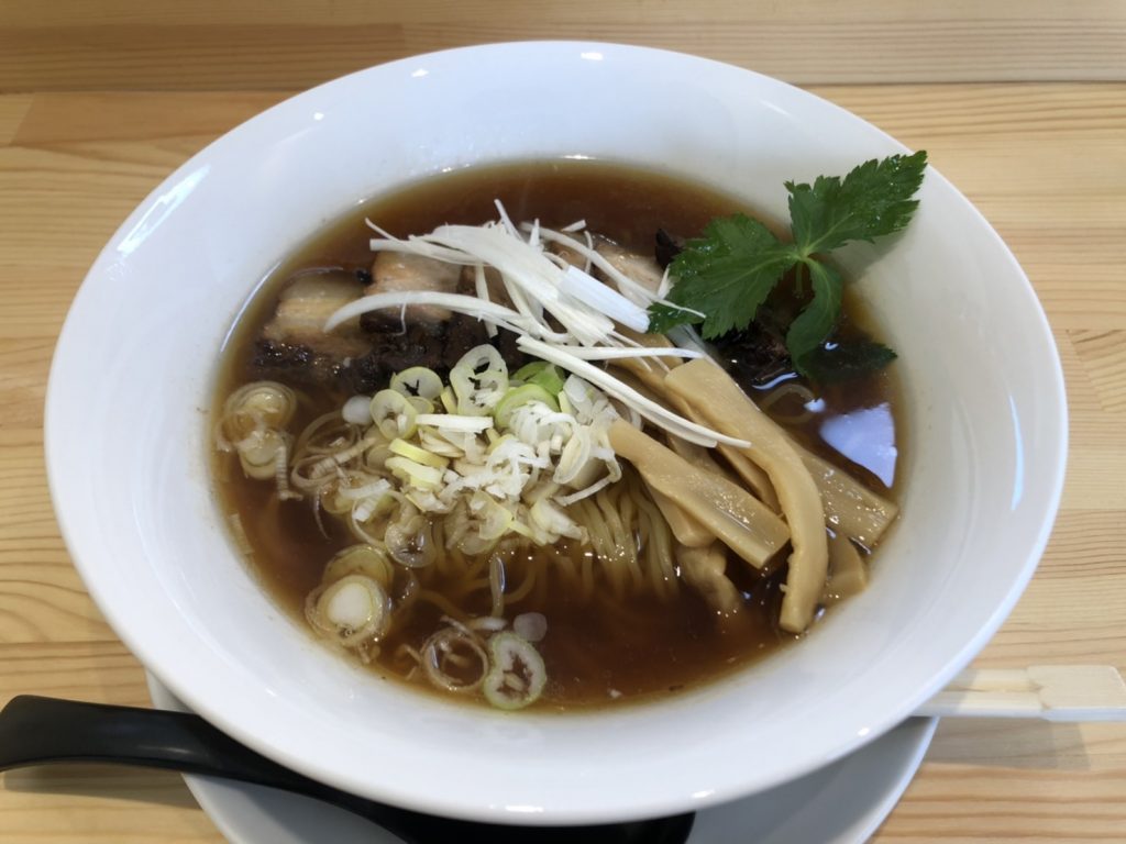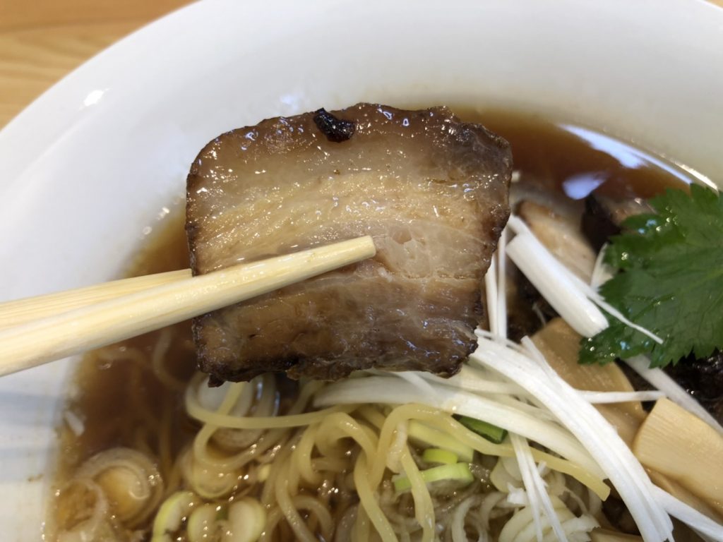 濃い色のスープはコクと甘みが喉の奥で感じられ、もうひと口、もうひと口とレンゲが進みます。白髪ネギとメンマ、三つ葉、そして豚バラチャーシューが6枚もトッピングされていました。