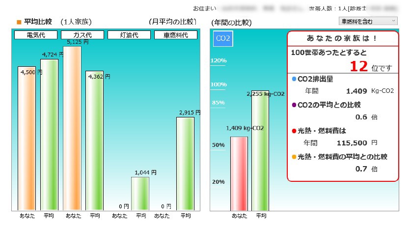 「すごい!年間のCO2排出量もわかるんですね。うちは409kg-CO2で、平均と比べて846kg少ないようです!」
