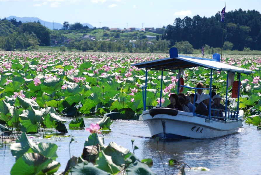 ラムサール条約にも登録されている「伊豆沼・内沼」で楽しむはすまつり。小型遊覧船で回遊しながら、沼一面に咲くハスの花を間近に愛でることができます。東京ドーム83個分という、東北最大級の敷地に咲く花々は圧巻! ハスの花が咲き始める午前中の時間帯がおすすめです。