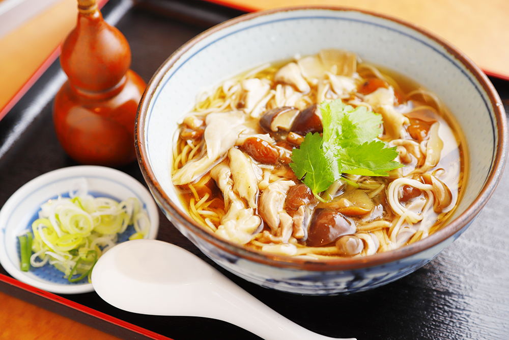 なめこや舞茸、しめじなど6種類のきのこと鶏もも肉がのった香り高いきのこそば。そばは冷やしに変更することも可能です。