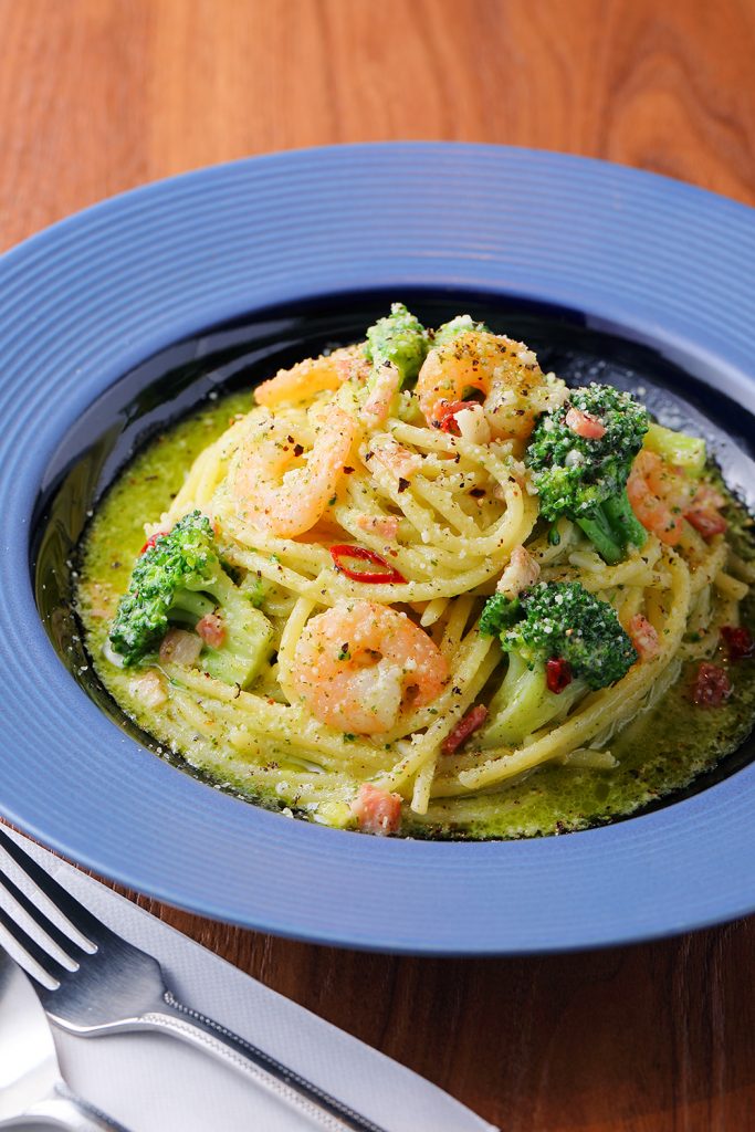 こだわりの生麺を使った人気のパスタが味わえます。写真はエビとブロッコリーのジェノベーゼ。※メニューは不定期で変更
