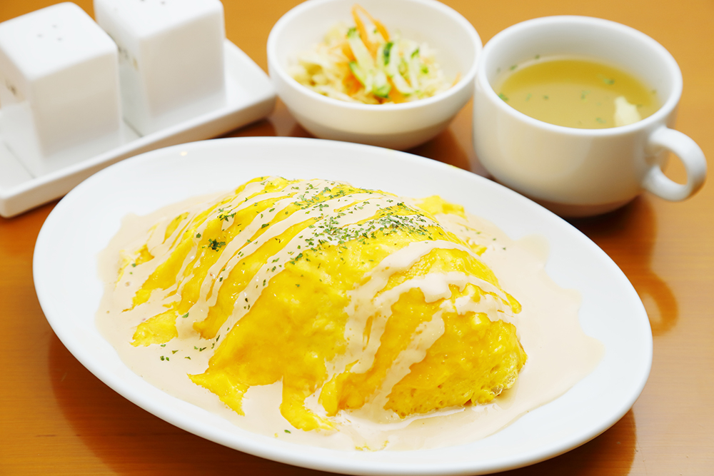 バター醬油風味のピラフとふわとろオムレツとの相性は抜群。ソースは和風クリーミーソースと梅和風ソースから選べます。