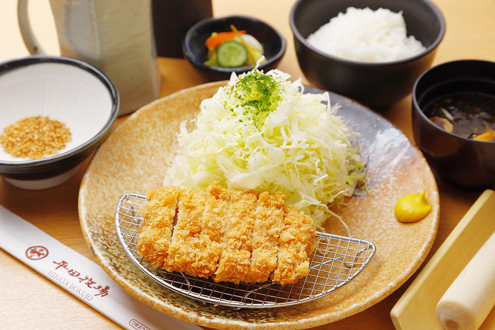 使用する平田牧場の三元豚は、きめ細かな肉質とあっさりとした上品な甘さが特徴。ソースや塩など好みで味を変えて楽しんでみては。