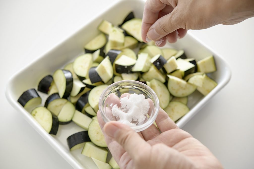 ナスは塩を振って水分を出してから焼くと 油をあまり吸い込まずヘルシーに!