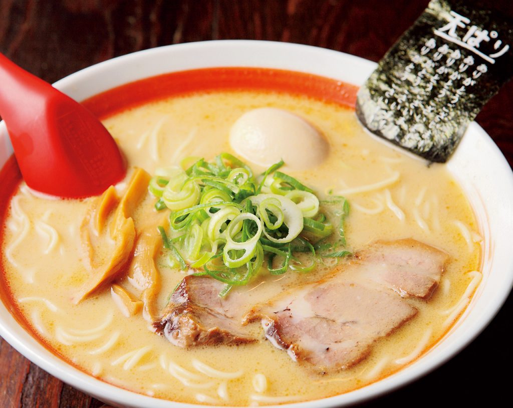 オリジナルの薄皮で作る餃子が人気の『餃子の天ぱり』。その餃子と人気を二分するのがこちらの「久留米ラーメン」です。豚の背骨を長時間かけて煮込んだ白湯スープは、本場・久留米の味を再現したもの。麺はもちろん細ストレート麺です。熊本から取り寄せた高菜や定番の紅ショウガをたっぷりのせ、豪快に召し上がれ!
