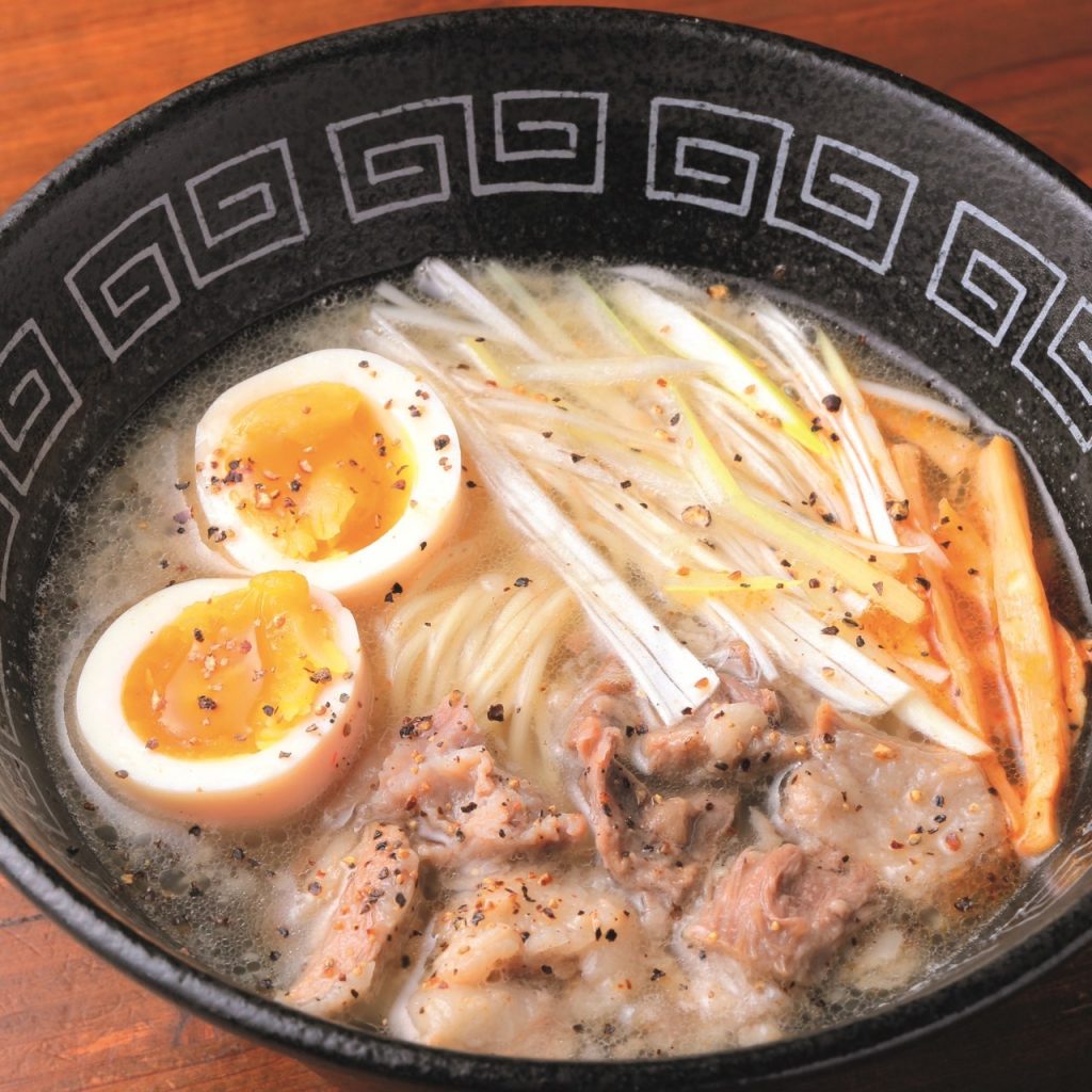 『ラーメン次郎』をこよなく愛し、東京に足繁く通った店主が営む一軒。「ラーメン」は豚骨を砕いて髄から旨みを抽出したスープが基本の次郎インスパイア。豚骨100%のパンチ力と乳化によるまろやかさがクセになる一杯です。ゴワゴワ系の自家製麺との相性も抜群ですよ。大河原の玉松醤油に特注したオリジナルを使った「醤油ラーメン」が一番人気です。