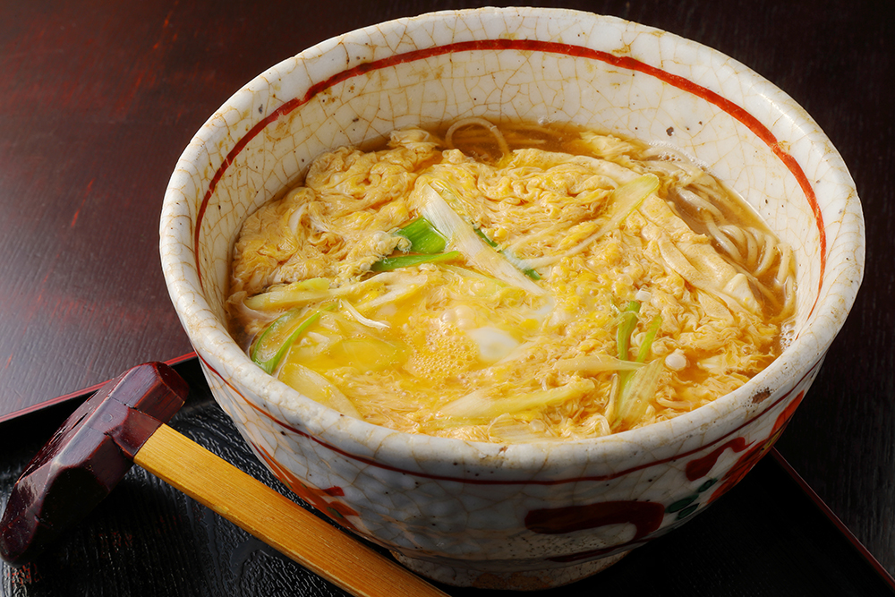 全国から厳選したそば粉を使った自家製そばと、生姜の風味を効かせたコクのある甘めのつゆの「かき玉そば」。