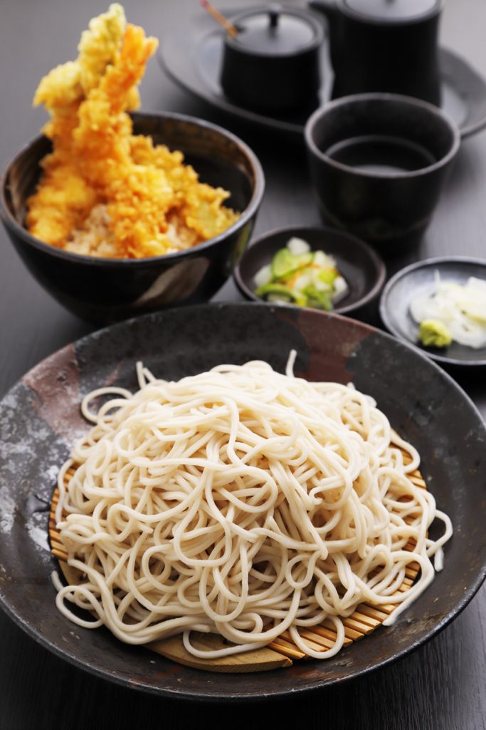 揚げたてのエビ天と3種類の野菜天をのせたボリューミーな天丼と、自慢のそばをセットに。そばは4種から選択可能です。