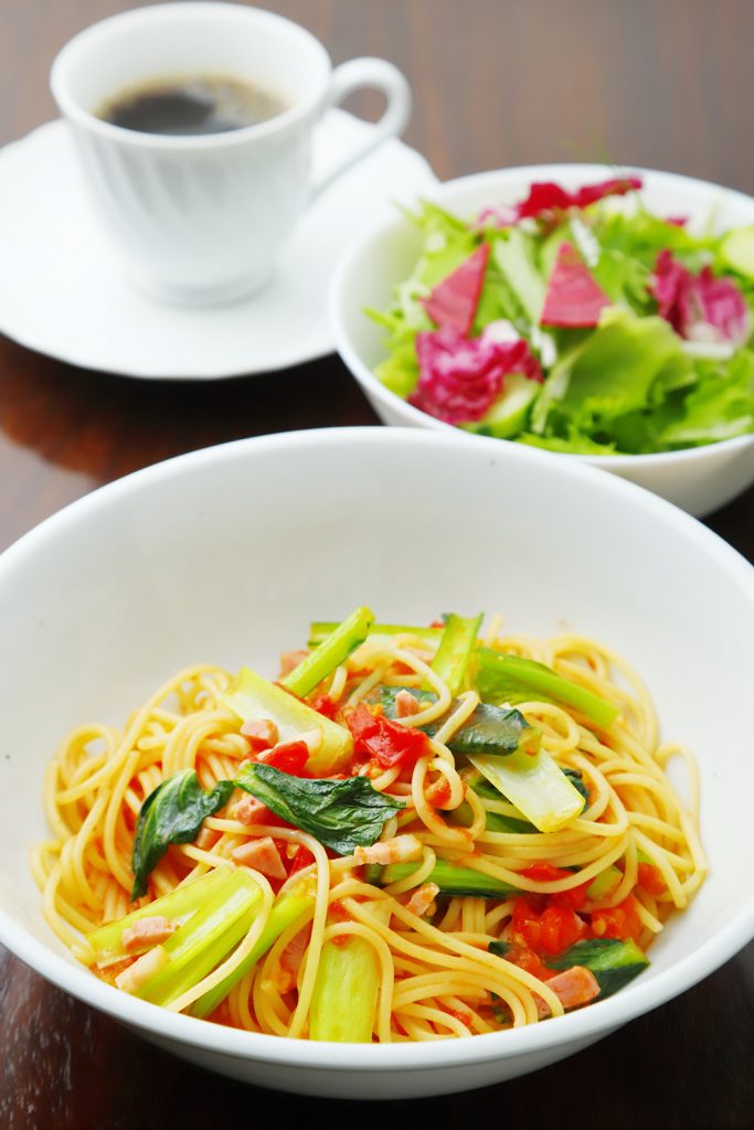 3.「小松菜とフレッシュトマトのスパゲッティ」/きたさん食堂