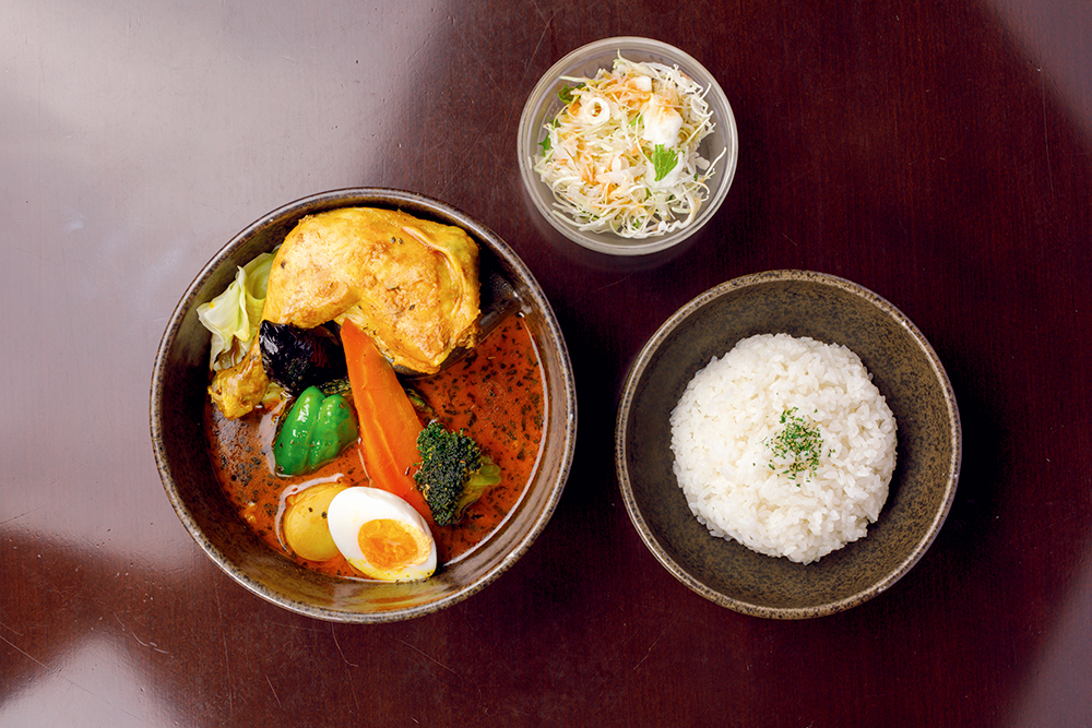 オーナーの武田さんは元サラリーマン。出張で訪れた北海道・札幌でスープカレーのおいしさを知り、「食べ歩くだけでなく自分でも作りたい!」とオープンを決めたそう。そんなスープカレーマニアの武田さんが作るスープカレーは、鶏ガラを長時間煮込んで作るブイヨンをベースに、トマトと和風のだしを合わせた「オリジナルスープ」と、エビの頭を使って作る「濃厚エビスープ」の2種類。メイン食材(野菜・チキン・ベーコン)、辛さ、ご飯の量を選んだら自分の好みのスープカレーが完成です。