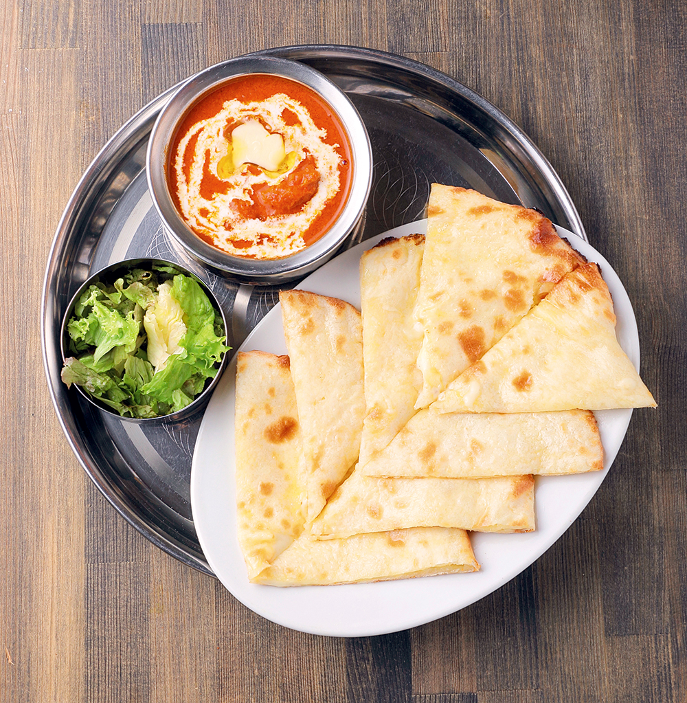 ほろほろと柔らかなチキンがおいしい「チキンバターマサラ」(1,012円)※写真は+220円でナンをチーズナンに変更