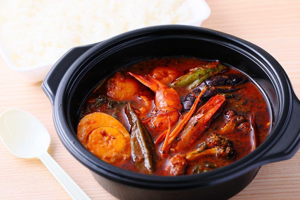 コリアンダーやショウガを効かせたトマトベースのスープや比内地鶏を使用したあっさりスープなど全6種類のスープから選ぶことができます。辛さも40段階からセレクト可能!有料のトッピングやご飯の量を選んだら、自分の好みのスープカレーが完成です。ベースのスープは、ピリッと辛くとろみのあるトマトスープが人気。今回は、有頭エビとアサリ、イカなど魚介類が入った「スープカリー」をオーダー!たっぷりの魚貝が入って食べ応え十分です。