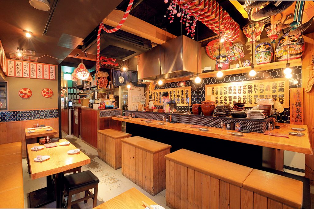 東北6県の祭飾りや伝統工芸品で賑やかに飾られた店内。焼き場から漂う炭火の香りに食欲がそそられる!