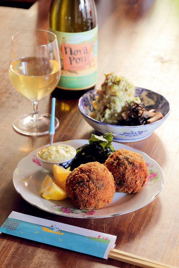 漁師家系で育ち、沿岸部の郷土料理が常に食卓に並んでいたという店主の伏谷さんが営む酒場。こちらでは、「真アジのたたき」や「志津川タコの出汁醤油漬」など海の幸をおいしくいただけます。中でも東松島の朝採れカキを使った「究極のカキフライ」(※提供は11月下旬からを予定)は食べるべき逸品。6個のカキをボール状に丸めて揚げることで、蒸し焼きのように旨みをギュッと閉じ込める。海の恵みに敬意をも感じる仕立ての奥深さに、ついもう一杯と手が伸びてしまいます。