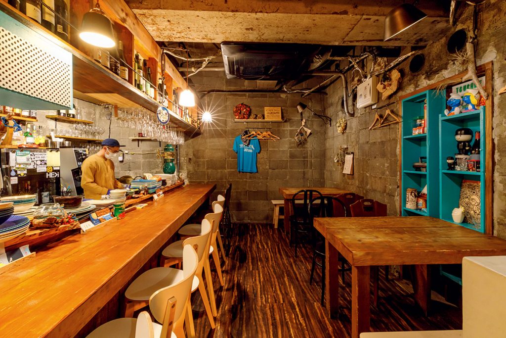 ビルの階段を上がると出会えるくつろぎの空間。テーブル席のほか、店内奥にはカウンター席もある