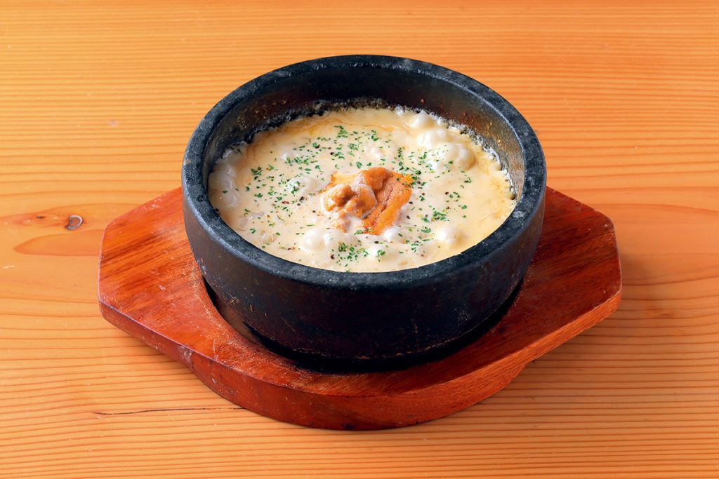 「石焼生ウニクリームリゾット」。ホワイトソースにウニペーストをたっぷり混ぜ込んだ贅沢な一杯。店長のおすすめはビールやハイボールと合わせて食べること!