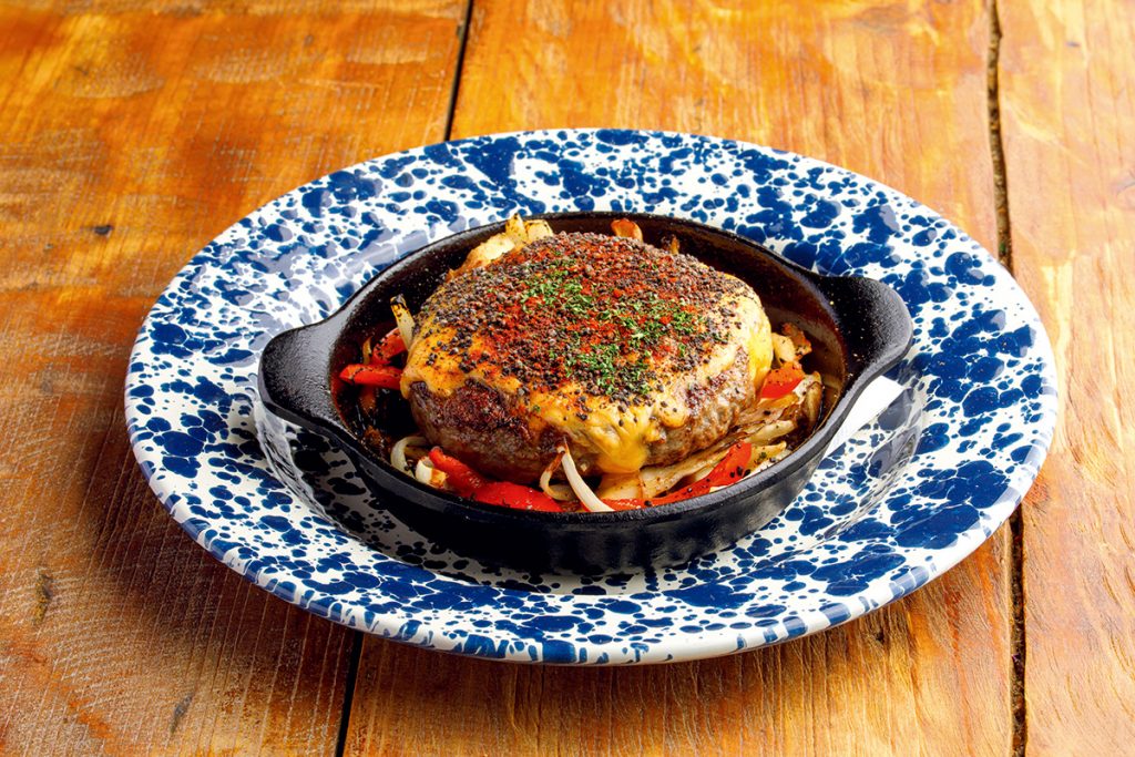 「牛粗挽き肉のステーキハンバーグ(200g)」は、繋ぎなし、牛肉100%でステーキのような歯ごたえ。自家製マッシュルームパウダーやハラペーニョピクルス、チェダーチーズを合わせた名物料理