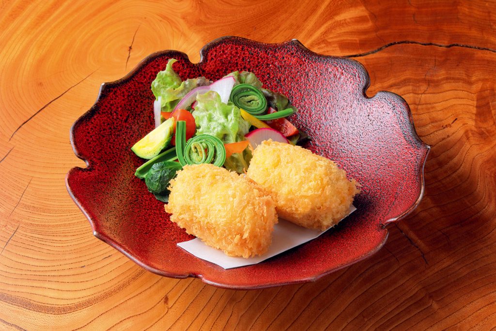 衣を割ると、なめらかな自家製ベシャメルソースがこぼれる自慢の「蟹味噌クリームコロッケ」