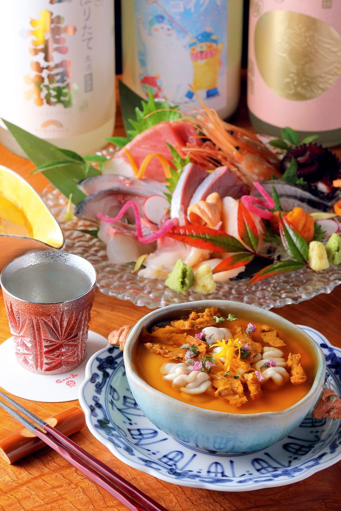 「鱈白子と海胆餡たっぷり海鮮茶碗蒸し」と「刺身盛合わせ」※ウニの茶碗蒸しと刺身は仕入れ状況により内容と値段が異なる