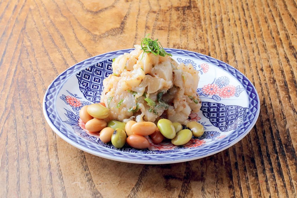 「ホタテ貝のなめろう」。漁師料理のなめろうもひと手間かけてワンランクアップ。肉厚なホタテ貝を醤油の搾りかすとオリーブの実でまとめたほんのり上品な味わい