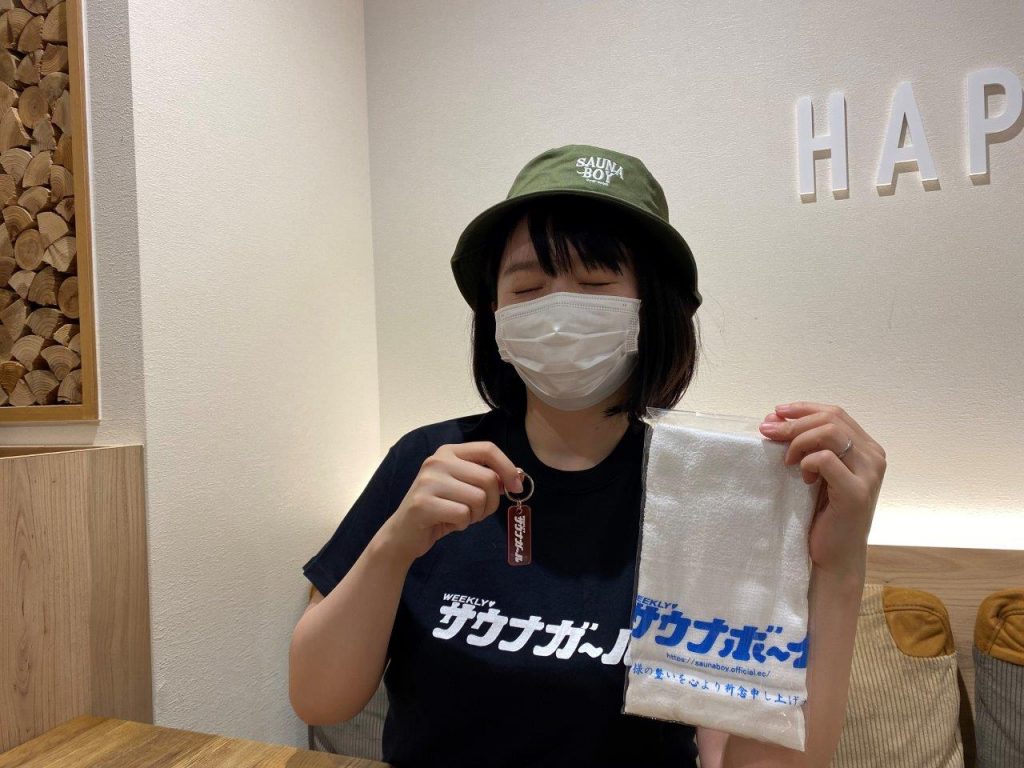 「サウナボーイの商品を5,000円以上購入した方には、『サウナボーイ』とロゴが入ったイベントオリジナルタオルをプレゼント!」と「整い顔」の佐藤さん。
