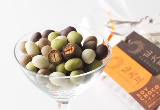 宮城県発祥の大豆「ミヤギシロメ」を焙煎しチョコで包んだ香ばしい風味と甘さが特徴のお菓子「ソイチョコ」
