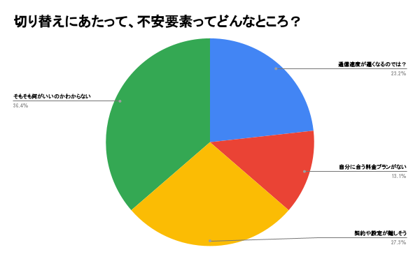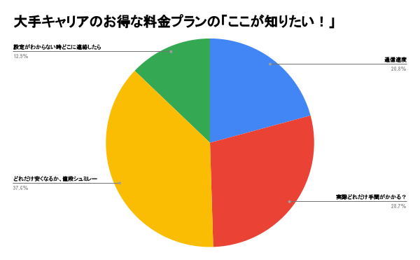 「金額」>「手間」>「通信速度」>「手続きの不安」の順で気になるよう。みなさん、大手キャリアのお得な料金プランへの切替、みなさん興味があるようですね!
