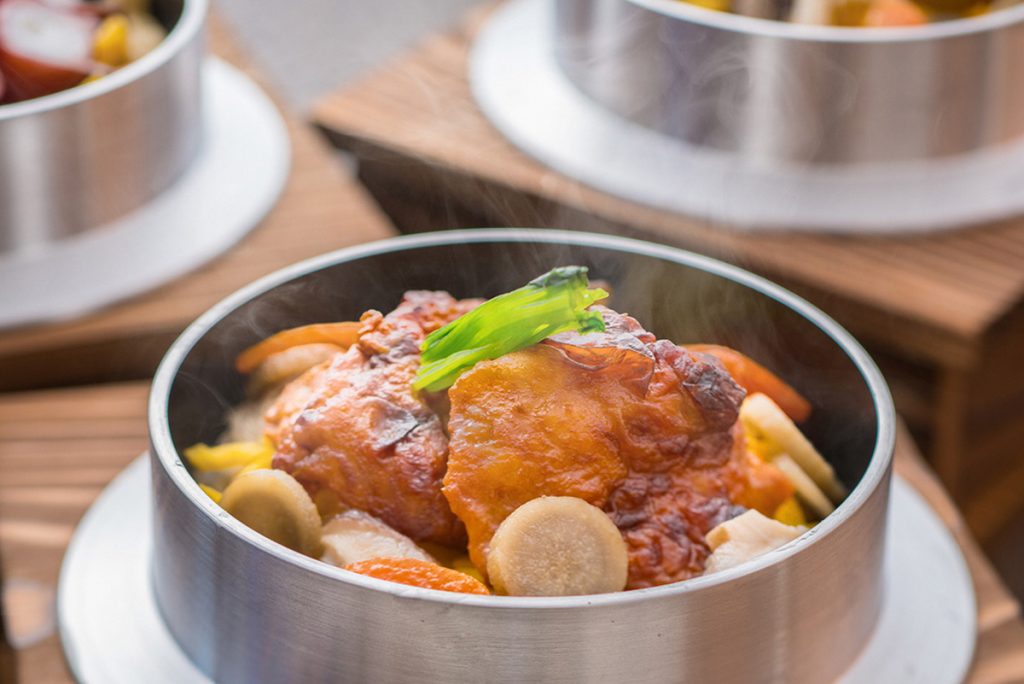伊達鶏は、適度な弾力と旨味あふれる肉質が特長。そのおいしさを、釜飯で存分に味わえる!