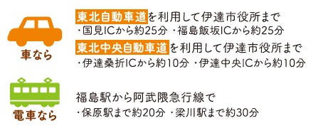 仙台市からは高速道路を使っておよそ1時間で行くことができます。