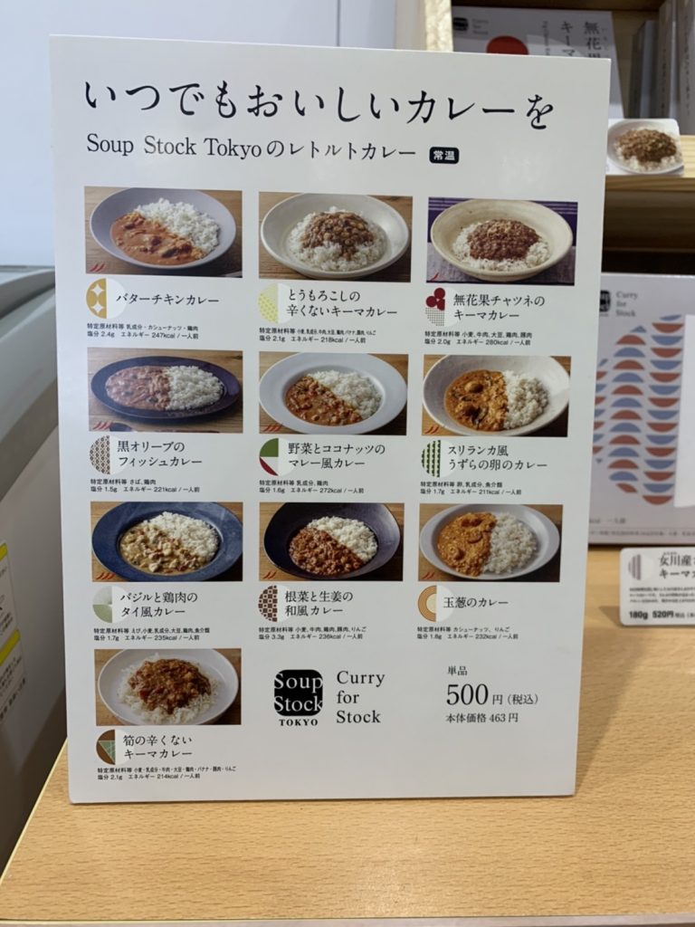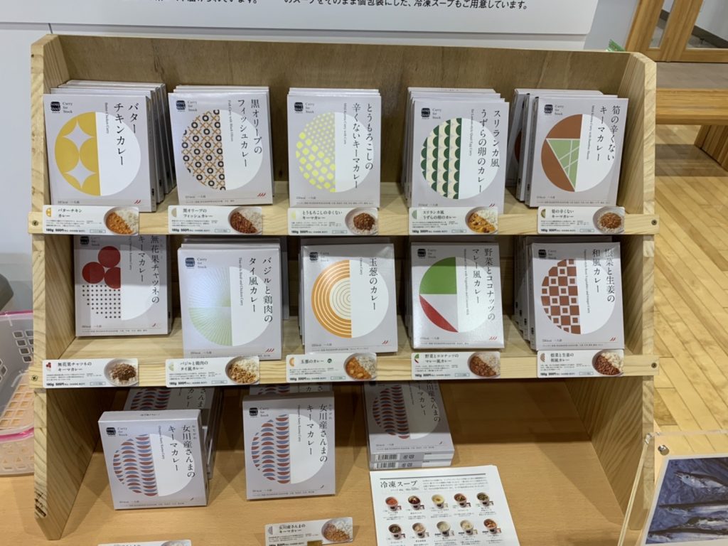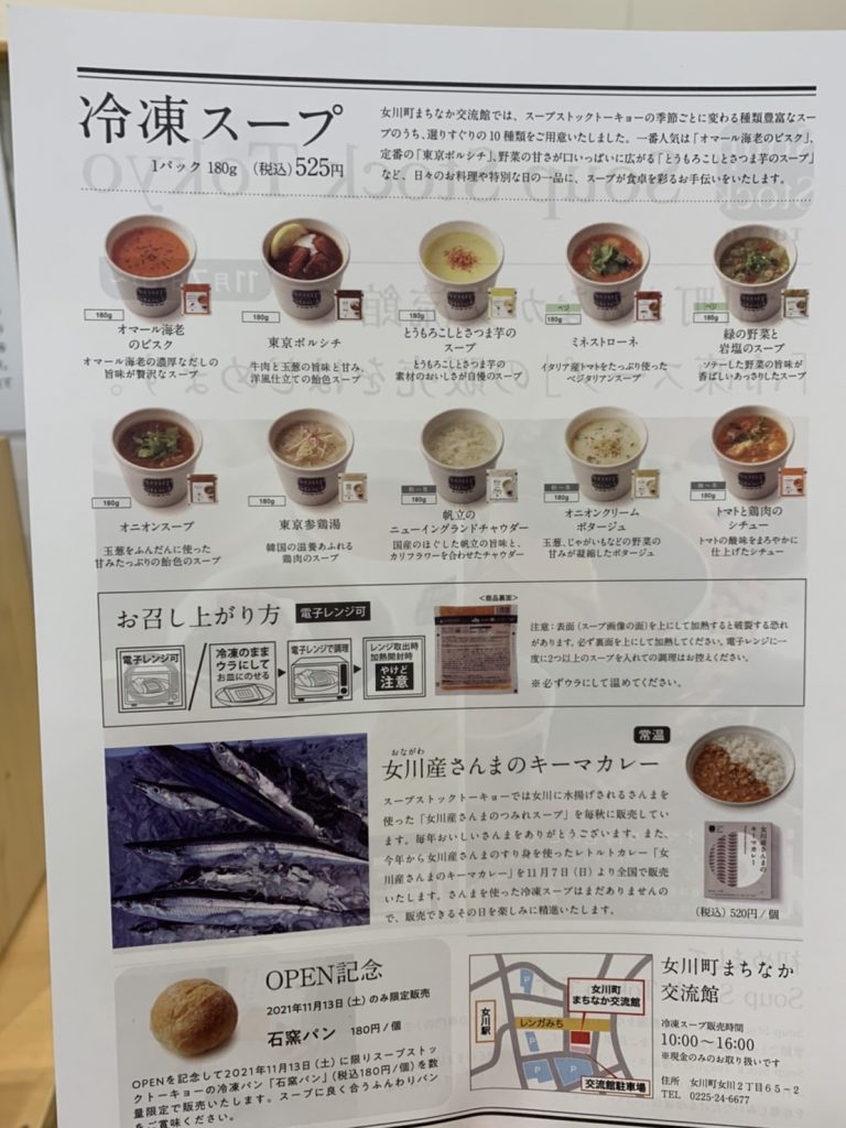『女川町まちなか交流館』では、『Soup Stock Tokyo』の季節ごとに変わる種類豊富なメニューのうち、選りすぐりの10種の冷凍スープ、11種のレトルトカレーを販売しています。