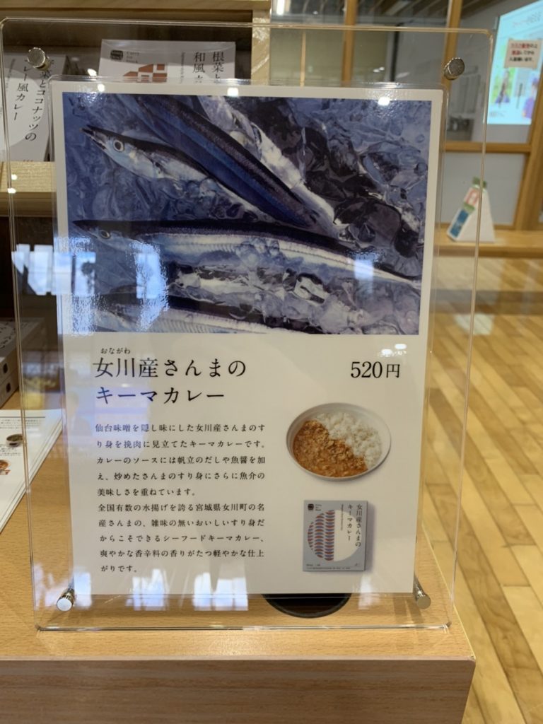 「女川産さんまのキーマカレー」はマストバイ!ホタテのダシや魚醤をカレーソースに加えたこだわりのひと品。数量限定での販売です